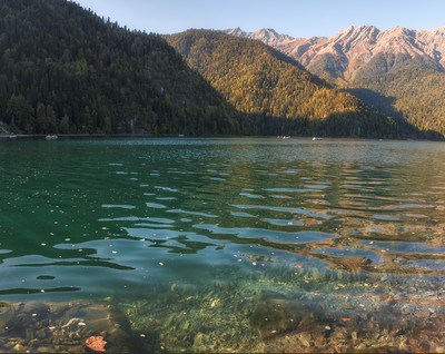 Озеро Рица, октябрь Расположено на высоте 950 м над уровнем моря, цвет водного зеркала меняется по временам года. Весной и летом преобладает зелено- жёлтый цвет воды, осенью и зимой — холодный сине-голубой. |