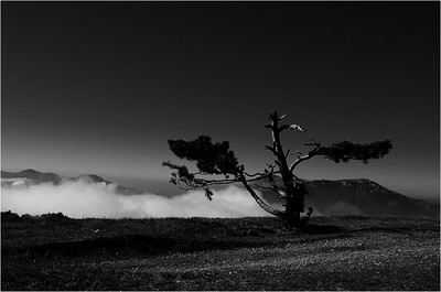 Где-то там На вершине Демерджи зимой дуют свирепые ветры...эта стойкая поломанная ветрами,но не сломленная сосна,похожа на раненую птицу,которая хочет улететь,но может...Но она всё-равно парит над облаками... |