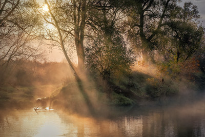 Последние теплые лучи октябрьского солнца прорвались сквозь тучи, деревья и туман, высветив старые коряги на излучине Истры.