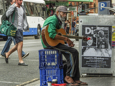Похоже,что у этого бедняги,кроме гитары больше и нет ничего...