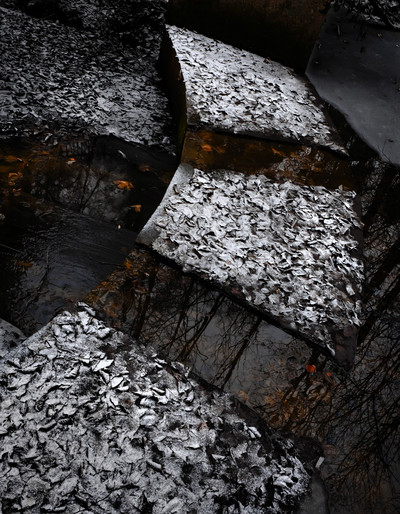 Просто искусственный водопадик, вид сверху. Но ситуация с листьями и инеем уникальная. Больше я такого не видел, хотя заглядываю в этот уголок регулярно.