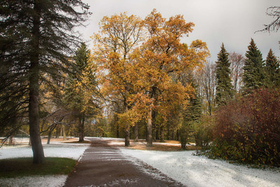 Деревья ещё в осени, а трава уже в снегу. Замечательный контраст!