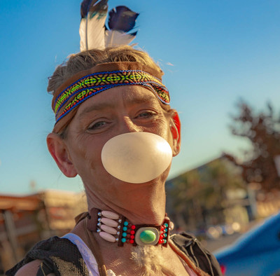 Калифорния. ПРИКЛЮЧЕНИЕ. Вчера шла по улице CHERRY, наслаждаясь мороженым из русского магазина. Встретила невероятную особу, пожилую даму со следами былой красоты в ИНДЕЙСКОМ КОСТЮМЕ. Я выразила восторг и принялась её снимать (камера всегда при себе) Она была довольна вниманием и выпустила пузырь из жвачки с видом "А НАМ ВСЁ РАВНО"! Затем она начала очень быстро и нечётко говорить, из чего я поняла, что меня куда-то зовут и хотят что-то показать. Я послушно пошла, интересно же! Она повела огородами в какую-то глушь, где обычно кучкуются бомжи. По дороге я начала трусить, но сбежать было неудобно. Наконец, мы дошли до камня, где было написано DO NOT ENTER (не входить) Там, наконец, я увидела её жильё. Нечто вроде ВИГВАМа. Она залезла туда и я её сфотографировала как сумела. Из её невнятной речи я уловила, что старушка панкует, любит свободу и молодёжную музыку. Она хорошо причёсана, с макияжем, но без зубов. На прощанье она протянула руку для рукопожатия, от чего я уклонилась и предложила столкнуться локтями. Так мы и сделали....