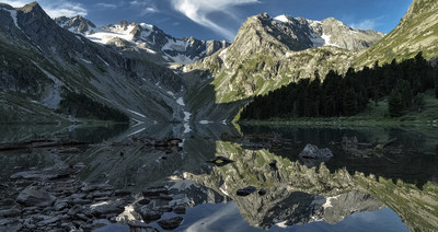 Геометрия. Верхнее Мультинское озеро.Посещение Верхнего Мультинского озера возможно только при наличии пропуска. Оформить документы можно на кордоне заповедника,на тропе встречались медвежьи следы.. но их мы видели только на обратном пути, так как вышли на озеро по темну, чтоб увидеть рассвет.Само озеро небольшое, форма озера вытянутая в меридиональном направлении.Склоны гор с громадными россыпями, небольшие опушки леса внизу и белые шапки снега и льда на остроконечных вершинах - все это отражается на водной глади этого красивейшего озера Алтая. |