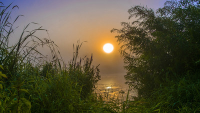 Летний туман на рассвете. Озеро Студёное в лугах Мещеры.