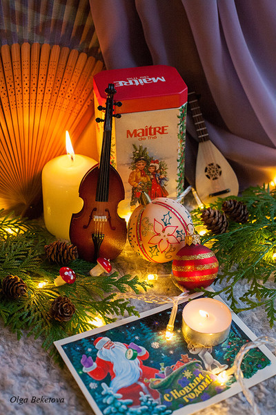 Новогодняя композиция из игрушек, свечей и огоньков.