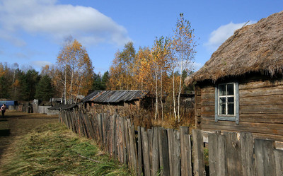 Наверное давно заброшен, раз на участке такие берёзы выросли. Неплохая композиция.