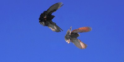 Голуби КРЫМСКИЕ БЕСКРУЖНЫЕ в полёте Спаровавшись ПО ЛЮБВИ,-вопреки желанию хозяина,-голубь особенно активно ухаживает за избранницей, не отставая ни на миг.В данный момент понуждает её сесть на гнездо,хотя она не готова.Ну, МУЖЧИНА всегда остаётся МУЖЧИНОЙ! |