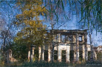 Отражение заброшенной усадьбы в пруду.