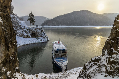 Отлично! Проглядывающие скальные камни сквозь снег, одинокое дерево, зимнее солнце, катер в заливе-всё привлекает внимание!