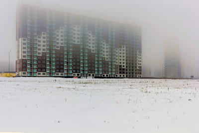 Зимним утром в декабре. Вид на городской массив со стороны поля. Когда опускается туман. Окраина города. Дом и его архитектура в тумане.. Опустился туман на город...