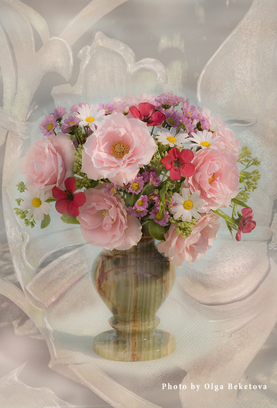 Розовые розы в вазе из оникса, ромашки и мелкие цветочки в букете.