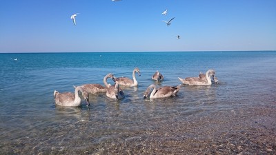 Молодой выводок лебедей на море.Через неширокую прибрежную полосу пресное озеро,где они постоянно обитают в камышах.Белую окраску обретут после линьки.