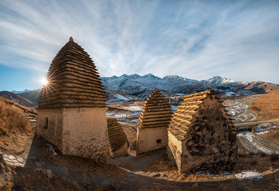 «Город мёртвых» Также называется Дарга́всский склеповый могильник — комплекс наземных и полуподземных склеповых сооружений XIV—XVIII веков у селения Даргавс в Северной Осетии. Историко-этнографический комплекс. Склепы башенного типа многоярусные, с деревянными перекрытиями. За счёт ярусности склепов и многослойности захоронений в небольшом по площади комплексе покоится около десяти тысяч человек. 2 января, 2021 года. Из фотопроекта «Кавказ без границ». |