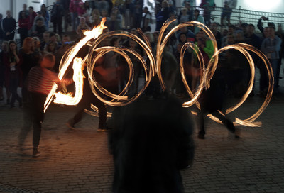 Скорость затвора 8/10 секунды, репортажная съемка в формате RAW, манипуляции с изображением выполнены в момент съёмки. Огненное шоу на Славянском базаре в Витебске.