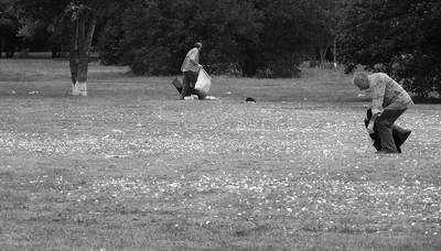 Яков Лесной, Начну с конца. Если вы считаете это шедевром, то это ваш очень странный выбор. Называть самый обычный ситуативный кадр шедевром я бы точно не стал. Странно также, что вы выбрали именно его. Вряд ли стоит объяснять, но для вас сделаю исключение и остановлюсь подробно: это жанр, т.е. все как есть, не постановка и, тем более, не коллаж. Как можно легко понять, люди собирают мусор (я писал об этом выше, но для тех, кому интересно), в большом количестве оставленный на поле после празднования Дня студента в местном университете. Полагаю, если вы увидели слюну или сопли, а также бутылку, мусор обнаружить было еще легче. Да, вы почти угадали: главное тут - разбросанный мусор и те двое, что его собирают. Спасибо за замечания. Кстати, надеюсь, что теперь мой выбор данного кадра и его содержание более понятны (я уже указывал, что он был вызван темой флешмоба ). Если - нет, то могу подробнее и другими словами. Кстати, вы ничего по поводу ног на своем коллаже не ответили.А жаль! Я бы с удовольствием почитал.