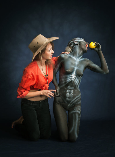 Не-не-не. От библейских сюжетов тут нет ничего. Одна модель предоставила свою тушку под аэрографию. А другая - это та художница, которая и нарисовала все А так как автор живойписи и "произведение" захотели запечатлиться вместе - вот и пришлось им фрукт выдать. А главное - этот аэрограф такая штука противная, угваздали мне тут все белые поверхности, еле отмыл потом |