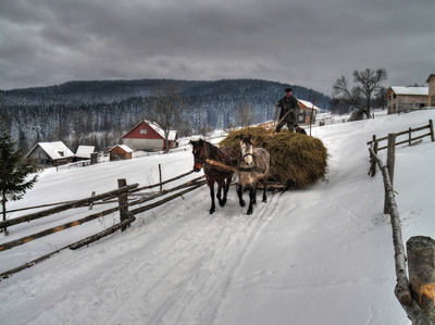 Домой с сеном Высокие окрестности села Лазещина (Карпаты). Январь 2017 г. В Карпатских селах покосы часто располагаются на склонах в стороне от жилья. Летом все сено по-возможности перевозится во двор и складывается в сараи, чердаки или большие стога под крышей. Но бывают случаи, когда сено во дворе уже складывать просто негде. И тогда зимой по мере его расходования за сеном надо ехать на свои покосы, чтобы привезти его во двор |