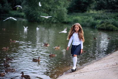 Замечательно перекликаются на фоне озера светлые цвета одежды девчушки с белыми летающими птицами! Красивый снимок!