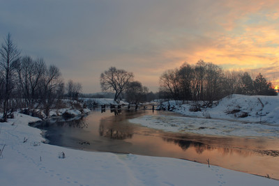 Отлично! Вечерний контрастирует со снегом, а ещё незамёрзшая река с отражением....