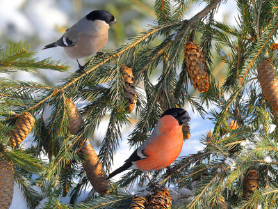 Семейная пара К привычным местам обитания снегири возвращаются с наступлением весны, но уже в конце зимы самцы предпринимают попытки завладеть симпатиями самок. Чем ближе и отчетливее чувствуется тепло, тем настойчивее становятся самцы. В этот период начинают формироваться первые пары, после чего снегири приступают к сооружению гнезд. Птицы их размещают на густых еловых ветках, подальше от ствола дерева, а также на соснах, на высоких кустах можжевельника. |