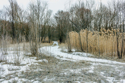 Утром ранним в начале марта. Пасмурно. По дороге к лесу, мимо камышовых зарослей. Почти стаял снег. Вдаль по дороге к лесу.. Дорога в лес... Утренние заморозки, в начале марта..