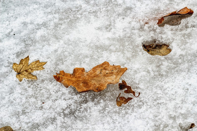 Опавшие зимой.. Листья на льду и во льду. Утром весной по календарю в начале марта.. Замороженные и замерзшие.. Когда начинает приходить весна, и последние утренние морозы. И в природе происходят некоторые можно сказать чудеса.. Природные явления перед весной.. На снегу покрытом кромкой льда образуются впадины вокруг листьев, которые опали только в последние дни зимы.. |