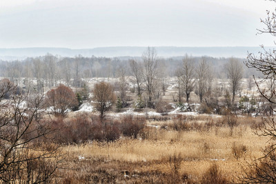 Немного туманно.. С высокой точки, с пригорка. Взгляд на местность.. Вдали туман полосой.. Лесной массив в дымке тумана. Когда утром приходит весна.. Голые деревья и еще лежит снег, оставшийся. И камышовые на переднем плане, придающие немного цвета в пасмурное утро. |