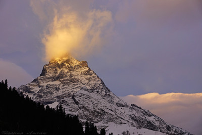 "Ночевала тучка золотая..." "Ночевала тучка золотая На груди утеса-великана..." /М.Лермонтов/ Но о том, что золотая, она узнала лишь с первыми лучами солнца... Вот какое чудо повезло подглядеть в одно чудесное зимнее утро. Красавица Белалакая в свете первого луча восходящего солнца. /Белалакая («опоясанная белым») — пёстрая, полосатая скала, скала с белыми полосами. Ее тело и впрямь прорезают полосы белого кварца, из-за чего гора и летом выглядит почти так же./ Домбай. Тебердинский заповедник. Большой Кавказ. |