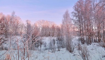 Вечерняя солнечная подсветка деревьев покрытых инеем