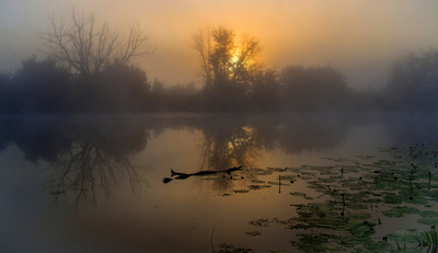 На озере туман.