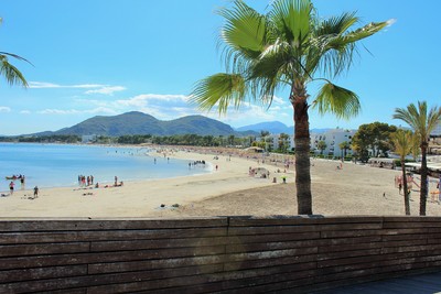 Вот такой очень красивый пляж в городе Алькудия на острове Майорка.