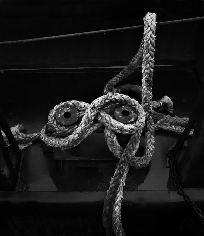 Не морской, а речной узел. Эта до невозможности проржавевшая баржа стояла на Неве, до моря далеко. Единственными не ржавыми на ней были канаты, которые и привлекли внимание своими фигурами.