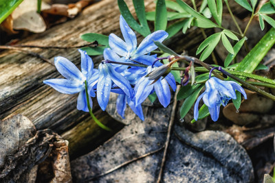 Пролесок, вид сверху.. В режиме макро. В лесу утром в траве. Поникший под натиском капель, после дождя. С каплями на соцветиях, и листьях травы, весной..