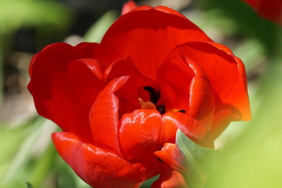 Весна всё-таки пришла! И стало очень жарко...Красный тюльпан спрятался в тени малины