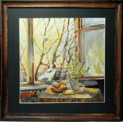 Весна. Распахнутое окно. На подоконнике голубь. У окна стол. На столе цветущая верба в вазе.Чай в чашке. Булочки в корзинке.