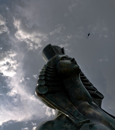 конечно же, про комарика это была шутливая интерпретация, а по-настоящему, и будь "комарик" повёрнут хвостом в другую сторону, как по мне, акцент сместился бы с "Древность в современности" в сторону лёгкого футуризма: люди в вертолёте случайно оказались на похожей планете, но с гигантскими размерами всего того, что было на родной, на Земле). подлетели вплотную и смотрят, а глаза-то у каменного сфинкса оказались живыми...