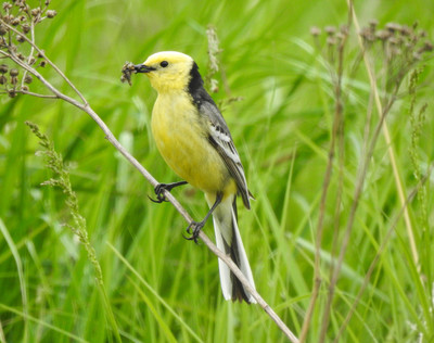 Самец желтоголовой трясогузки с добычей. Самка - на следующем фото.