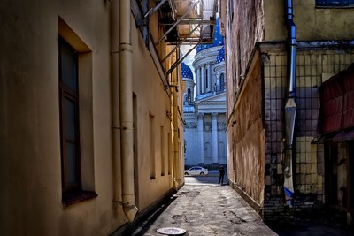 Обычно в таких проулочках тень, но вы удачно выбрали время для съёмки. Правда не каждому удалось бы его использовать, как вам: мало того, что снято против света, но при этом так выразителен цвет куполов, и даже часть водосточной трубы, каким-то образом, с ними перекликается по цвету. Удивительный снимок!