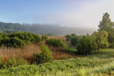 Утром на местности.. Уходящий туман. И открывается местность с ее растительностью летом. Вдали немного туманно. Свет после рассвета утром и туман..