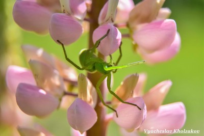 Зеленый паук на цветке люпина