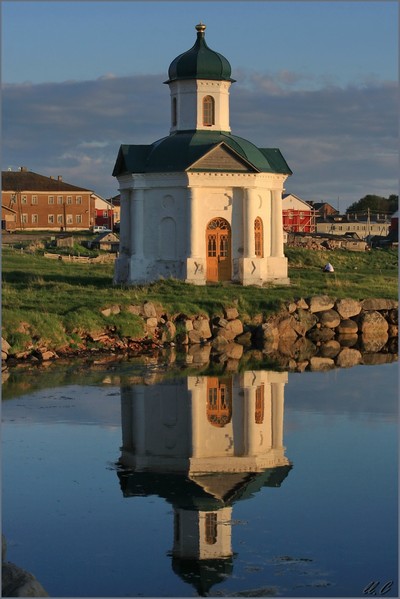Часовня Александра Невского . Перед стеной монастыря на берегу бухты Благополучия стоят две мемориальные часовни середины XIX века. До их возведения здесь располагались первые гостиницы, хлебные амбары, сараи для хранения выловленной рыбы, промысловые избы. В 1858 г. к северу от Святых врат, около Царской пристани, была установлена восьмигранная каменная часовня во имя святого благоверного князя Александра Невского (Александровская) — в память посещения Соловков императором Александром II. |
