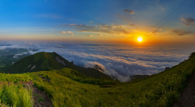 Утро на вершине горы Бештау, облака наползают на город Лермонтов внизу