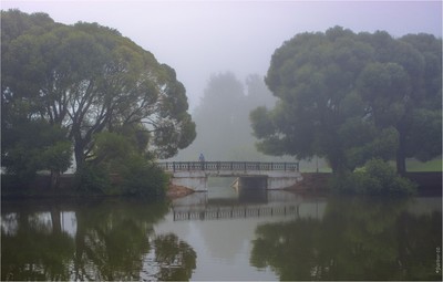Vera Petri, Если внимательно присмотреться, ивы по обе стороны мостика не без помощи тумана "рисуют" своими кронами два профиля животных. Слева угадывается силуэт тигра, справа кабана. Оба образа весьма агрессивны. Как-то так....