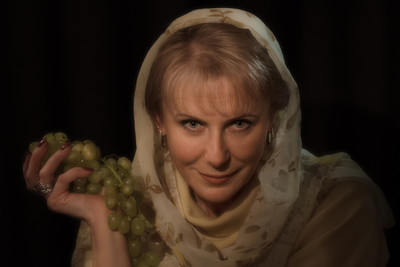 Автор Работы, несколько факторов:взгляд, слегка снизу вверх, который "кажется" не направленным в объектив (тени под бровями), плюс точка съёмки выше глаз, плюс рука с виноградом чуть назад (как будто забыла, что в руке виноград)... но игра всё таки осталась... и уж точно не из-за тени под носом |