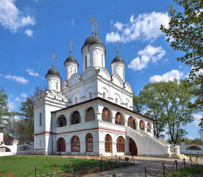 Церковь Преображения Господня в Больших Вязёмах Четырех столпный пятиглавый храм во имя Преображения Господня с двумя симметричными приделами на территории усадьбы Большие Вязёмы был построен по заказу Бориса Годунова в 1598 году, Храм стоит на высоком подклете и с трех сторон окружен открытыми галереями с арочными проемами . «Церковь о пяти верхах» -- так говорится о храме в летописях. |