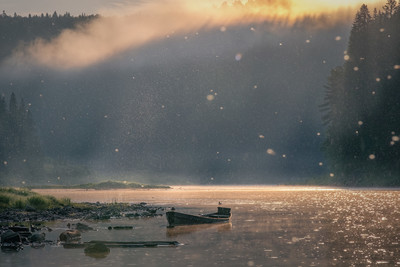 Рассвет жаркого дня на Чусовой. Слепой дождик пробивается сквозь облака поденок на фоне восходящего из-за туманных предгорий солнца.