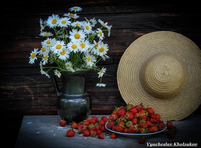 Натюрморт с ромашками и клубникой