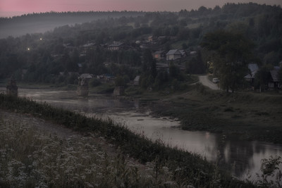 Миновала полночь. Легкий ночной туман струиться вдоль реки над спящим поселком.