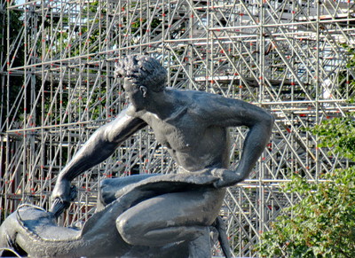 Скульптура Мухиной "Вода" в Лужниках на фоне будущего стадиона чемпионата мара по пляжному футболу ФИФА.